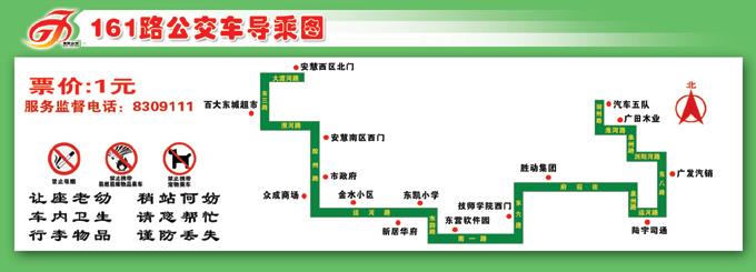 1、161路自汽車五隊發車經湖州路→淮河路→泉州路→瀏陽河路→東八路→運河路→泉州路→府前街→東六路→南一路→東四路→運河路→膠州路→淮河路→東三路→大渡河路→安慧西區北門,票價不變。