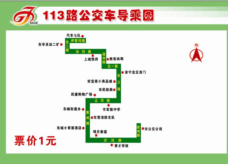 113路:該線路自汽車七隊始發,經伊犁河路(華瑞小區)、東二路(東辛采油二礦、盛大商場),改經汾河路(青盛小區、上城悅府)、溫州路(勝宏尚郡),到達北一路后,恢復原線路,線路里程、票價、班次均不變。