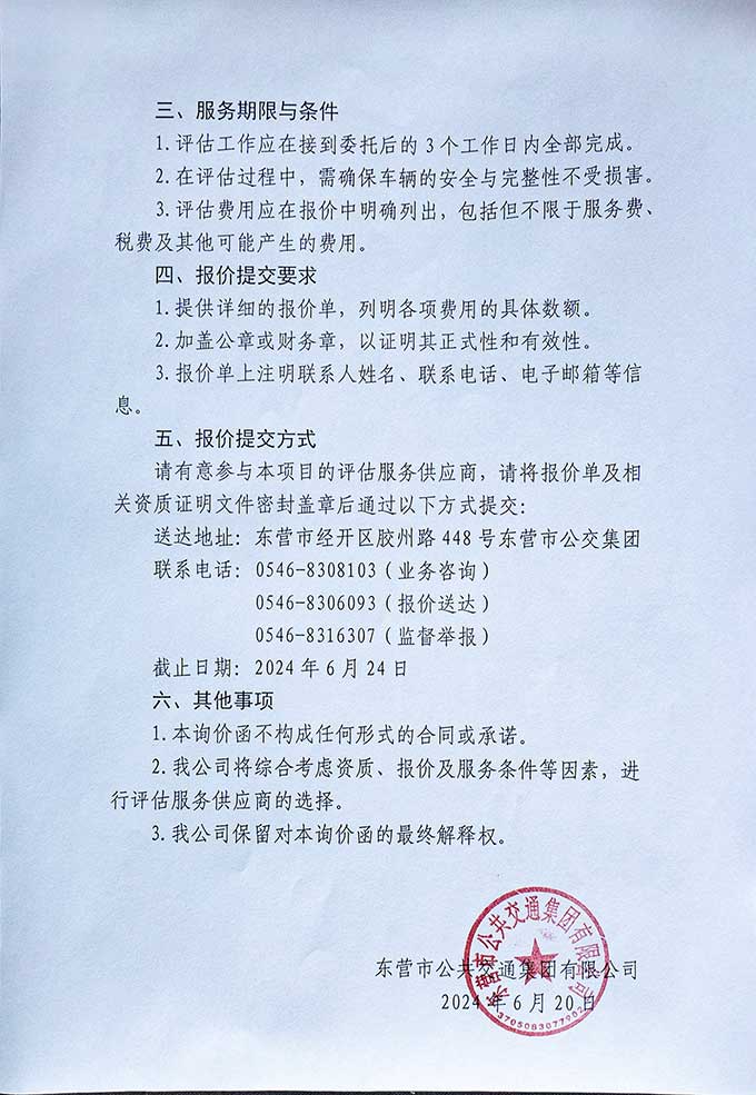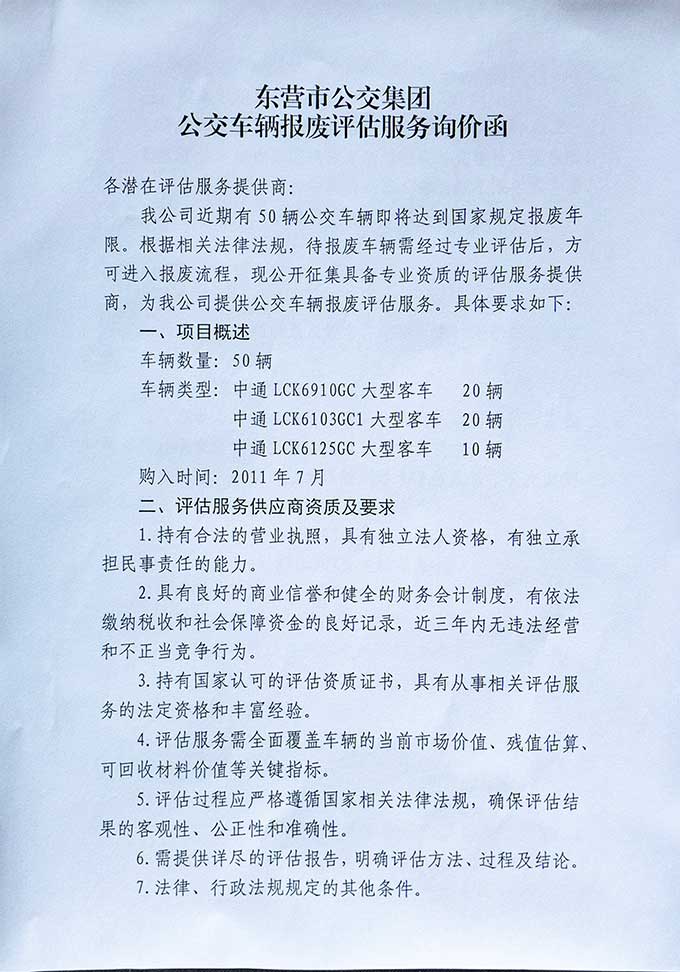東營市公交集團公交車輛報廢評估服務詢價函