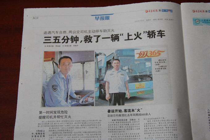 伸出援手的是公交公司3路車駕駛員商向陽和124路車駕駛員曹玉國(guó),兩人齊表示,只是恰好路過看到伸出援手而已,都是應(yīng)該做的。商向陽介紹:“自燃轎車的司機(jī)是女性,當(dāng)時(shí)她都沒有發(fā)現(xiàn)引擎蓋冒濃煙,公交車底盤高,我一扭頭就看到了,當(dāng)時(shí)事發(fā)鬧市區(qū),萬一燃燒起來引發(fā)爆炸之類的就太危險(xiǎn)了,于是我把公交車靠路邊停下,拎著滅火器就下來幫忙了。”曹玉國(guó)當(dāng)時(shí)駕駛著124路公交車看到這一幕,也緊跟著拎著滅火器下車幫忙。火撲滅后,兩位司機(jī)便回到公交車上開車離開了。