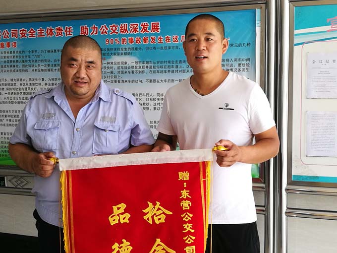事后,失主拿著錦旗來到市公交公司汽車七隊,找到車隊領(lǐng)導和駕駛員,感謝拾金不昧的好司機---楊寶海。