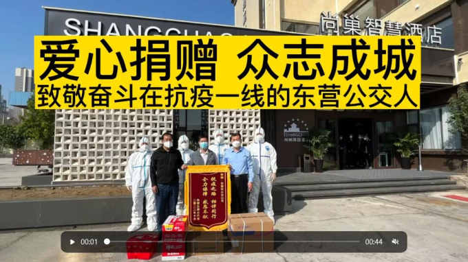 近日,在我市疫情防控的關鍵時刻,東營區群眾代表郭永軍捐贈一批愛心物資,用于疫情防控工作,為抗疫工作貢獻自己的力量,并向奮戰在抗疫一線的東營公交人送錦旗表示感謝,用真情和愛心傳遞社會正能量,助力疫情防控工作。