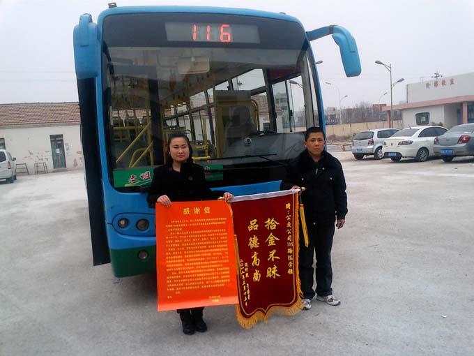 2012年3月14,勝利設計院職工于家星女士拿著一面寫有“拾金不昧、品德高尚”的錦旗和感謝信來到市公交公司汽車四隊,感謝116路魯E08350車駕駛員陳學強師傅拾金不昧的高尚品德。